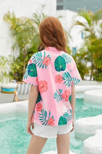 SANGTREE Girls Hawaiian Shirt Casual Short Sleeve Button Down Shirt Pink, 13-14 Years= Tag 180 6