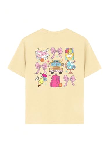 • Features: Cute t-shirt for girls is adorned with a playful and colorful graphic print on the back, featuring a collection of cute items such as bows, a cake, a backpack, and a robot, adding a fun and youthful vibe to the garment