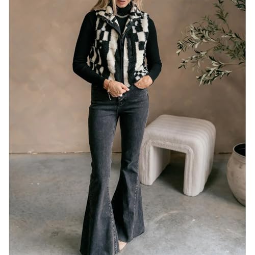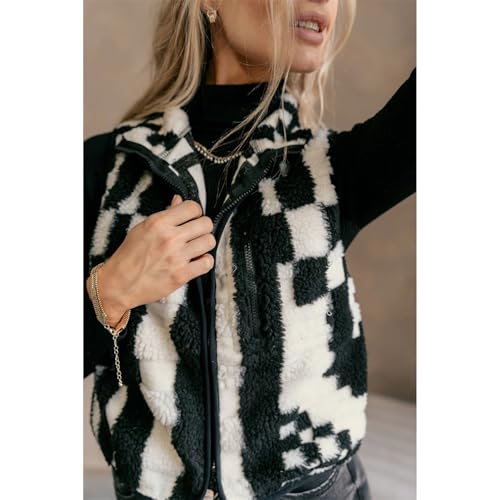 • Cute Zipper Fleece Vest: Womens Checkered Vest Sleeveless Winter Fleece Jacket features black and white sherpa fabric, checkered print, zip up front closure, high neckline, front chest zipper pocket and sleeveless, fuzzy cardigan, stand collar