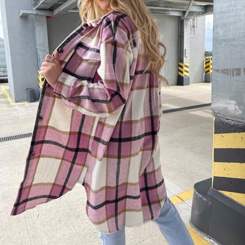 Womens Long Flannel Coats Plaid Shacke Oversuits Long Sleeves Suit Collar Casual Button Down Loose Trendy Jackets 6