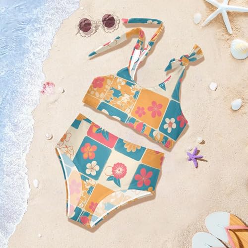 KLL Retro Checker Board Groovy Flower Girl Two Piece Bikini Sets Quick-Dry Swimsuits Swimming Suits Adjustable 2
