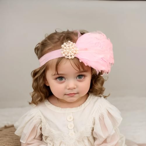 More information about Stretchy Baby Girls Feather Headband Pearl Beads Fabric Flower Elastic Toddler HairBands Birthday Party Princess Hair Accessoties for Newborn Infant (Pink B, Standard Small)