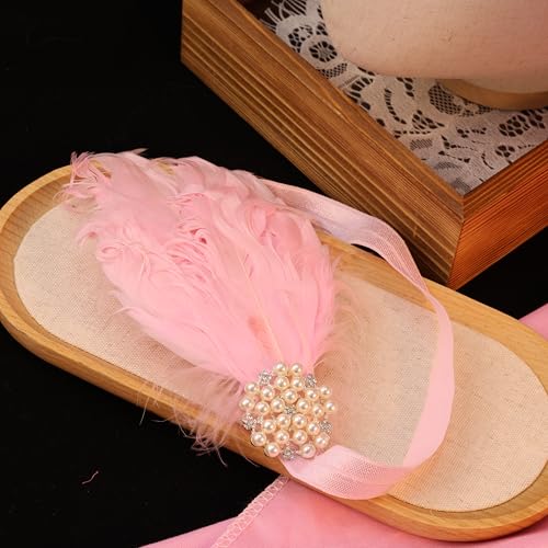 Stretchy Baby Girls Feather Headband Pearl Beads Fabric Flower Elastic Toddler HairBands Birthday Party Princess Hair Accessoties for Newborn Infant (Pink B, Standard Small) 5