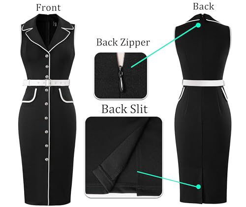 • Style: Notched Lapel Collar, V Neckline; Sleeveless; Color Contrast Patchwork Piping; Decorative Buttons; Fake Pockets; Undetachable Belt with holes to adjust; Bodycon Silhouette with a Concealed Back Zipper; Knee Length; A Back Slit for easy walking.