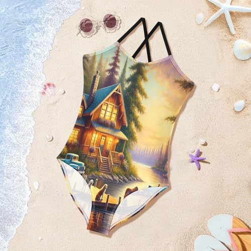 Wooden House Lake Swimsuit for Girls Bathing Suit Summer Beach One Piece Swimsuits Swimwear 4
