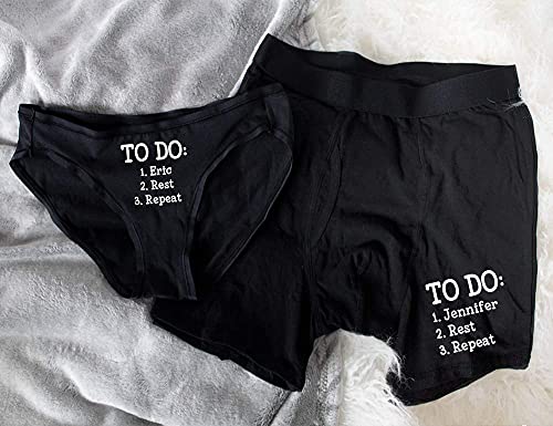 • 1 men's boxer brief and 1 women’s bikini underwear in black with "TO DO: 1. NAME 2. REST 3. REPEAT" design on front