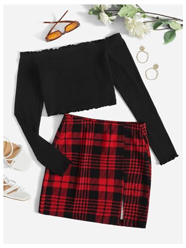 • Features: 2 piece outfits, off shoulder, ribbed knit, long sleeve, cropped, plaid, split hem, black and red skirt set for women