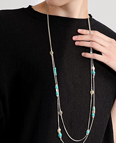 BULINLIN Layered Silver Long Necklace for Women Turquoise Stone Beaded Strand Sweater Chain Necklaces Fashion Costume Jewelry Gifts for Mom