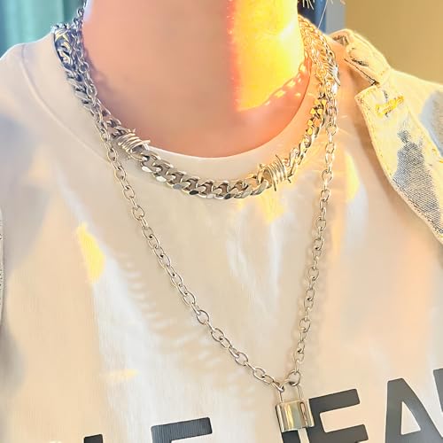 Barb Wire Choker Necklace Lock Pendant Necklace for Men Women Stainless Steel Layered Gothic Thorns Punk Chunky Chain Necklaces