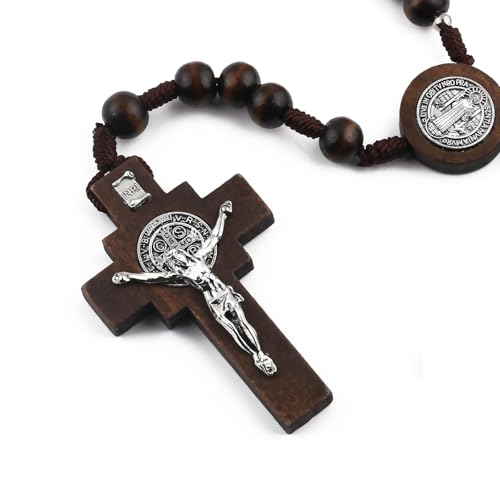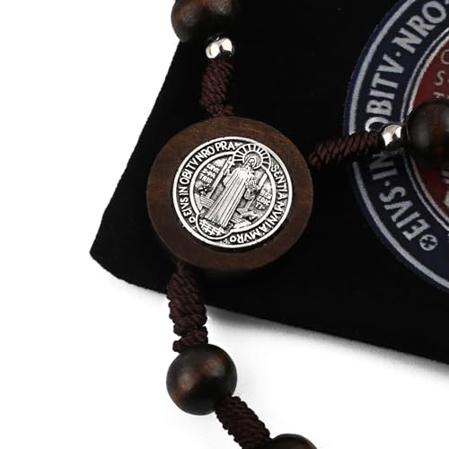Material: Wood, ZincMetal type: ZincClasp type: No ClaspChain type: BallGem type: No GemstoneTRADITIONAL DESIGN: Handcrafted dark brown wooden rosary featuring Saint Benedict medals and a detailed metal crucifixMATERIAL QUALITY: Smooth wooden beads connected with solid brown cord for long-lasting daily prayer useCOMPLETE SET: Includes a black velvet carrying pouch with embroidered Saint Benedict medal design for protection and storageBEAD DETAILS: Features large 8mm wooden prayer beads with metal Saint Benedict medallions at regular intervalsRELIGIOUS SIGNIFICANCE: Traditional Catholic prayer tool incorporating the powerful Saint Benedict medal design throughout Perfect for everyday use. first-class materials and excellent craftsmanship ensure long-lasting durability.
