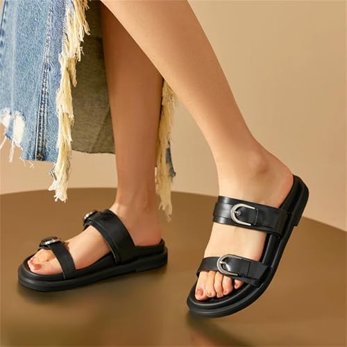 Women's Genuine Leather Slippers - Solid Double Strap Summer Beach Flats