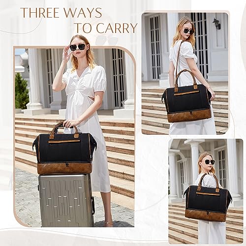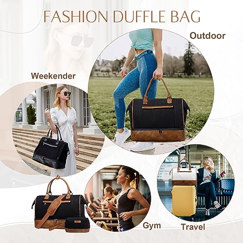 Travel Duffle Bag for Women,Vaschy 17'' Canvas Under Seat Carry On Weekender Overnight Duffel Tote Bag with Trolley sleeve/Shoe Compartment/Tolietry Bag Set for Travelling,Gym Black and Brown Leather