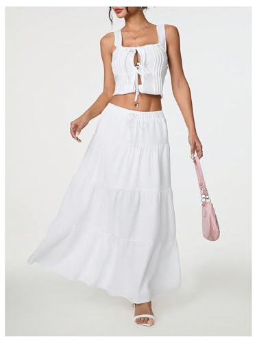 • Features: Skirt for petite women, elastic waist, ruffle hem, knot front, maxi, casual, flowy
