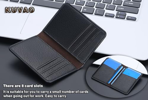 Brand: KUVAOColor: BlackMaterial: Faux LeatherStyle: LeisurePattern: textureThis is a lightweight credit card holder wallet with 8 card slots. It is made of very tender and delicate artificial leather. Its texture is close to genuine leather. I estimate that you will be satisfied with its quality.Each weighs approximately 20 grams (0.0441LB) and has dimensions of 4.13 x 2.87 x 0.276 in (10.5x7.3x0.7cm).Due to manual cutting of the material, please allow for slight errors in weight and size.top-grade PU leather,This leather material is professionally used for making wallets, with a soft, smooth, and durable touch. The quality belongs to the excellent leather materials in artificial leather.Main features: Convenient to carry, sometimes you only need to carry a small number of cards when going out, so it is very suitable for you.Soft material, emphasis on craftsmanship, giving you a good feeling. Perfect for everyday use. High quality materials and excellent craftsmanship ensure long-lasting durability.