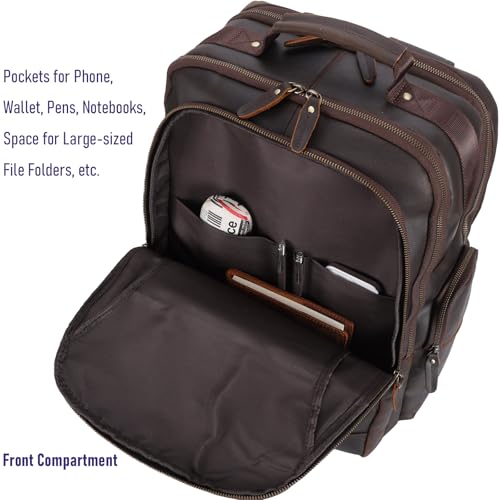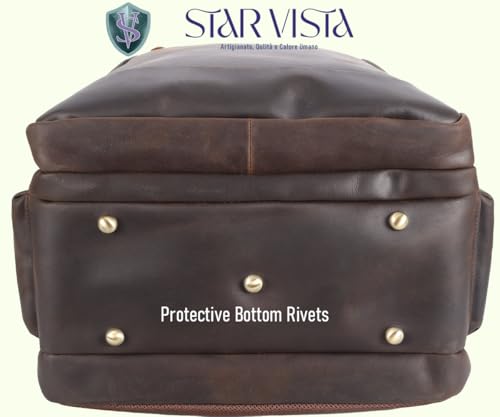 QUALITY / CRAFTSMANSHIP -- Crafted with full grain cowhide leather sourced from premium pastures, tanned with natural plant extracts, this STAR VISTA backpack is built to last with a elegantly vintage look and feel outstanding for outdoor hiking, camping, daily commute or business travel. YKK zippers along with other thick brass hardware ensure the backpack's durability in its everyday use for many years to come.ROOMY INTERIOR -- Featuring spacious main compartment and variety of front and interior zipper pockets, this backpack can accommodate a 17.3 laptop & 13 tablets along with notebooks, docs, portfolios, clothes, phones, wallet, glasses, power bank and other items, satisfying all your daily or outing needs, while keeping everything organized.DIMENSION / WEIGHT -- 18 (H) x 14 (W) x 9 (D), Weight 4.4 LBREASSURING SERVICE -- We promise a 1-year refund and lifetime customer service for every STAR VISTA product