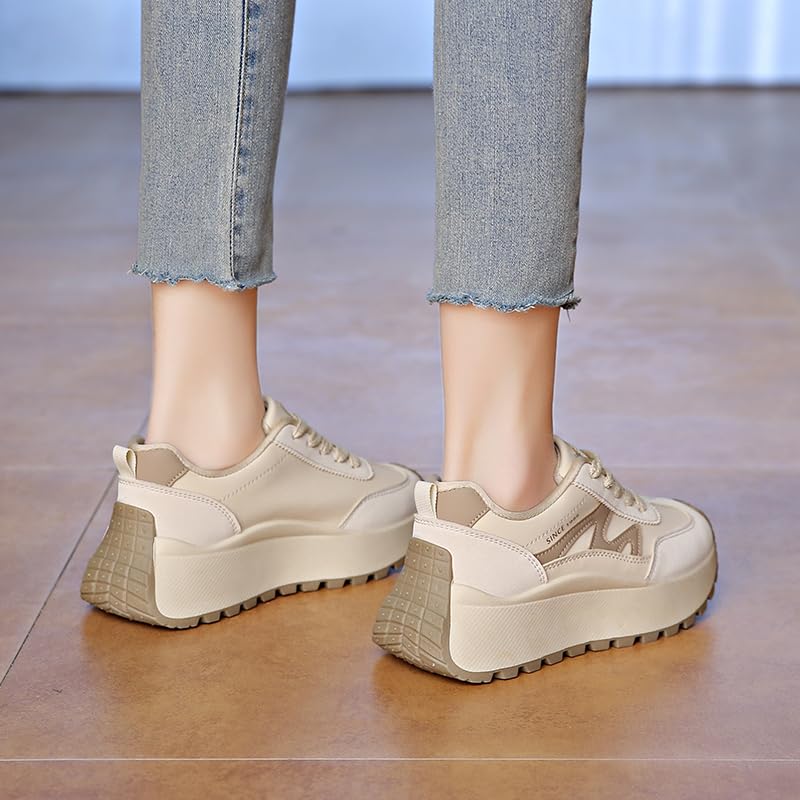 Women's Leather Thick-Soled Lightweight Non-Slip Casual Shoes Lace-Up Sneakers Suitable for Walking and Running