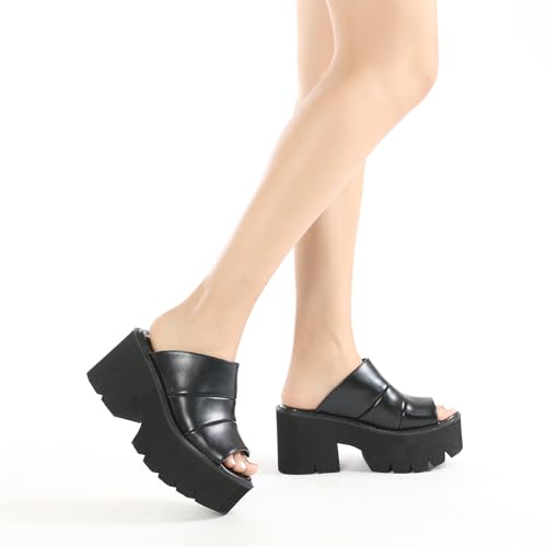 Women'S Black Leather Platform Chunky Heel Goth Slides Sandals Fashion Fish Mouth Comfort Slip On Anti-Slip Lug Sole Block Heeled Y2k Punk Slippers For Party Wedding Prom Evenin