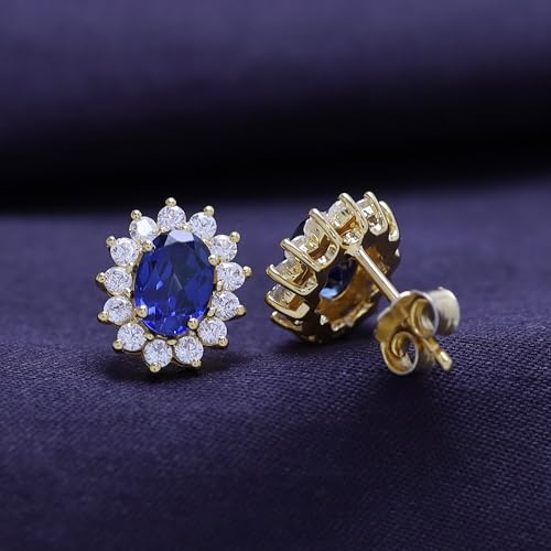 Blue Sapphire Oval Halo Stud Earrings – Simulated Gemstone with Cubic Zirconia, 14K Gold Plated 925 Sterling Silver, Elegant Jewelry for Women, Everyday or Special Occasions