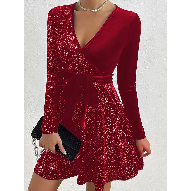 Highlights [Fabric] : Crafted from a luxurious blend of soft velvet, this elegant dress promises both comfort and a sophisticated feel. The micro-elastic nature of the fabric ensures a comfortable and flattering fit, adapting subtly to your body's shape. [Fit and Style] : This long-sleeve dress features a charming wrap-front design that complements your silhouette. Cut in a slim-fitting style that transitions into a playful A-line skirt, it is ideal for party events by accentuating your figure while offering ease of movement. [Design Highlights] : Adorned with dazzling sequins, this dress presents a glittering starry night effect, perfect for capturing attention at any event. The V-neckline adds to its allure, and a velvet tie at the waist enhances the overall silhouette. [Occasions] : Perfect for a variety of seasonal celebrations, this dress is an excellent choice for Christmas parties, formal gatherings, New Year's Eve festivities, and evening outings. It effortlessly adds charm and style to any sophisticated event. [Size Range] : Available in sizes S, M, L, XL, and XXL, this dress caters to a range of body types, ensuring a perfect fit that highlights your best features. Available in retro black as well as green, red, and royal blue, it offers versatile styling options for various occasions. Perfect for everyday use. first-class materials and excellent craftsmanship ensure long-lasting durability.