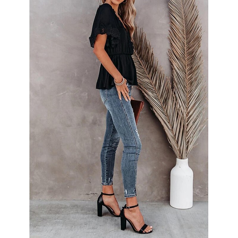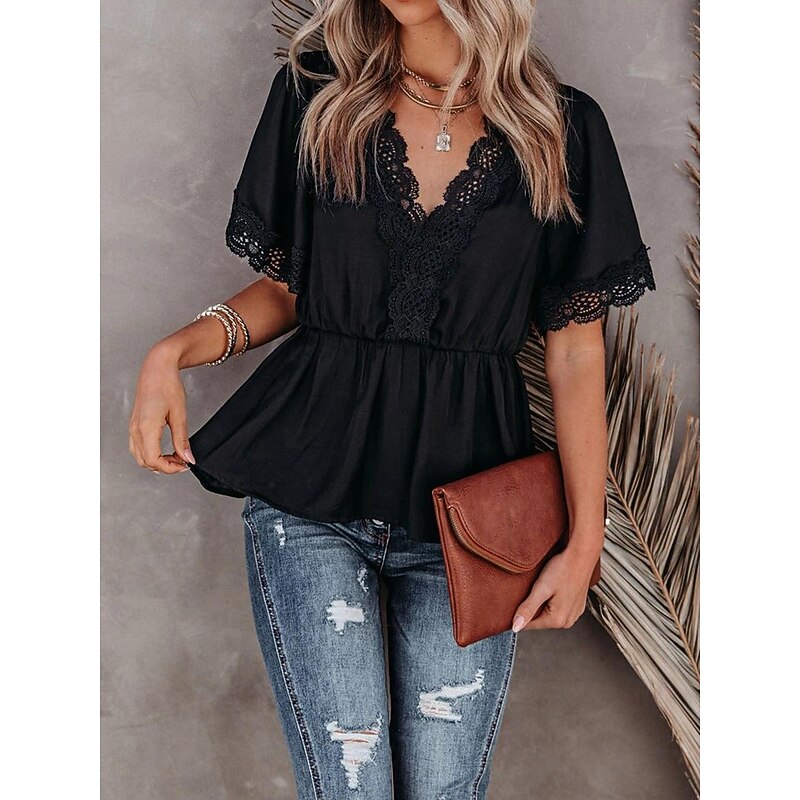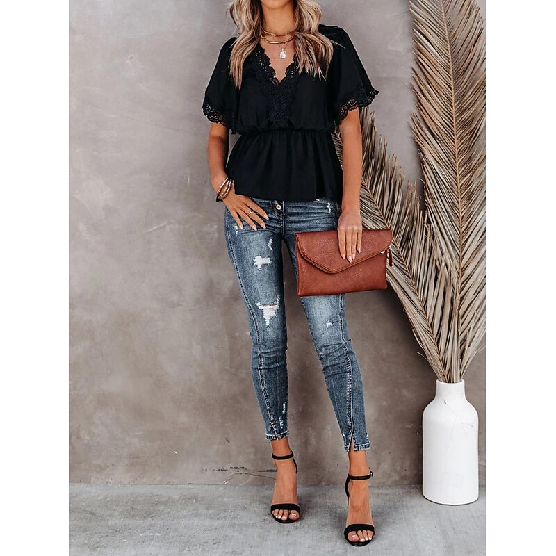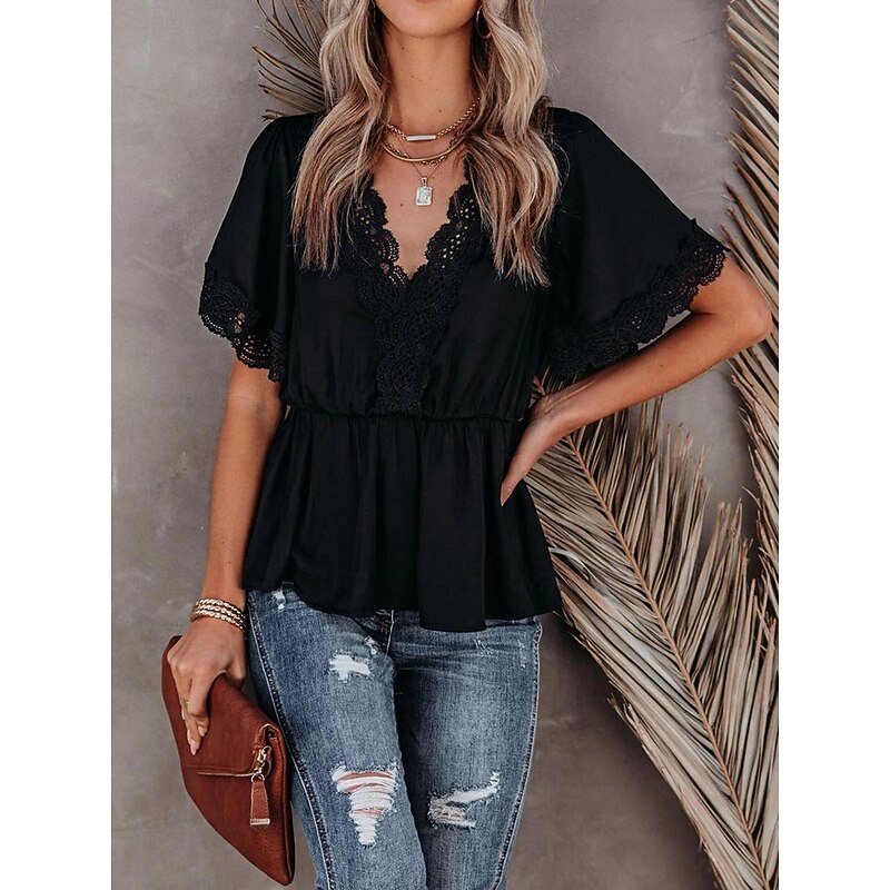 Highlights [Fabric] : Made from lightweight chiffon, this women's blouse is breathable and plush, ideal for warm summer days. The micro-elastic quality ensures a relaxed yet flattering fit. [Fit] : Designed with a regular fit, this blouse features a cinched waist that accentuates your silhouette while maintaining comfort. The flowing tunic style adds an elegant touch to your everyday wardrobe. [Design Highlights] : The blouse boasts short flutter sleeves with intricate lace detailing, lending a sophisticated and charming appeal. A deep V-neckline embellished with delicate lace trim enhances its romantic allure, making it a standout piece. [Occasions] : This versatile blouse is perfect for both daily street fashion and casual outings. Pair it with distressed denim jeans for a chic, bohemian look or dress it up for a more formal occasion. [Size] : Available in a range of sizes from S to XL, this blouse caters to various body types and preferences, ensuring a comfortable and contemporary fit for all.