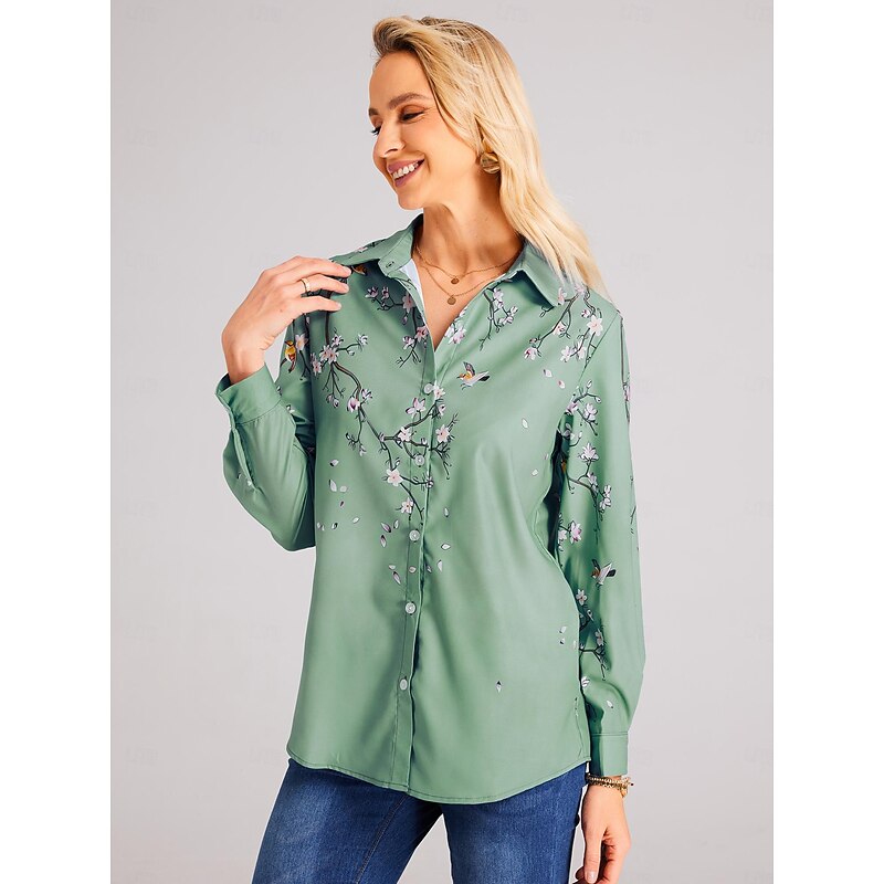sought-after ! Women's Shirt Button Down Tunic Shirt Collar Long Sleeve Floral Print Green Purple Blue Casual Holiday Elegant Fashion Spring Summer