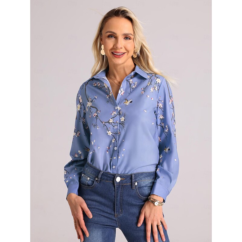 Highlights [Fabric] : Crafted from premium faille fabric, this blouse offers a smooth, lightweight feel with micro-elasticity, ensuring superior comfort and a flattering fit. The material choice makes it ideal for wearing during the breezy days of spring and fall. [Fit] : With a regular fit, this blouse features a retro shirt collar and a button-up front, providing versatility to style it casually or elegantly. The regular length and long sleeves, which can be rolled up for a more relaxed look, add to its adaptability. [Design Highlights] : Showcasing an exquisite 3D floral print intertwined with a bird motif, this blouse captures an artistic and nature-inspired essence. The thoughtful button design adds a touch of sophistication and modernity to the overall look. [Occasions] : Perfect for a variety of settings, from holiday retreats to casual outings, this top blends comfort with style. Its floral theme and vintage aura make it suitable for those who appreciate classic elegance with a contemporary flair. [Size Range] : Available in a range of sizes, from S to 2XL, this blouse caters to a diverse audience, ensuring a perfect fit for various body types.