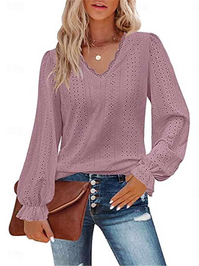 Women's Shirt Blouse Solid Color Basic Casual Long Sleeve V Neck Regular Tops Daily Lace Eyelet Light Green Pink Fall Winter