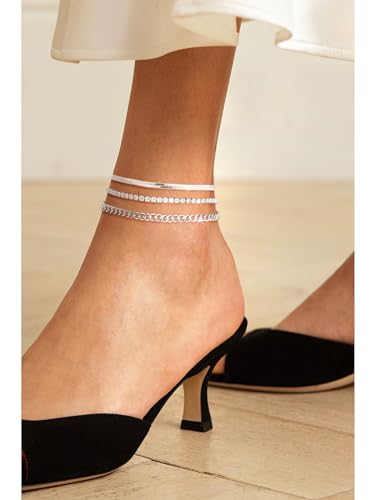 DEARMAY Dainty Silver Ankle Bracelets for Women Waterproof, S925 Sterling Silver Anklets Jewelry Layered Cuban Chain Herringbone Cute Anklets Set Pack Summer Beach Gift for Women Teen 3