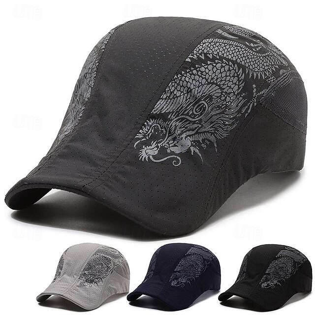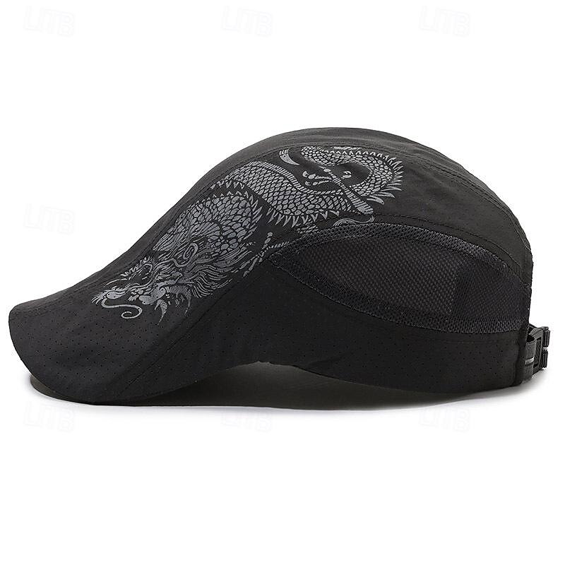 Highlights [Fabric:] Expertly crafted from high-quality polyester, this Men's Beret Hat offers a lightweight and breathable experience, ensuring comfort and durability for all-season wear. [Fit:] Designed to cater to a variety of styles, this hat features an adjustable strap, guaranteeing a snug and personalized fit for most head sizes. [Design Highlights:] Showcasing a distinctive dragon pattern, this cap adds a bold statement to any ensemble. Its structured brim not only elevates the style but also provides effective sun protection. [Occasions:] Whether for a casual street outing or daily wear, this versatile hat seamlessly transitions from casual to sporty looks, complementing any wardrobe choice. [Size:] Available in one size that fits most, this hat's adjustable feature ensures adaptability and convenience for various head sizes. ideal for everyday use. first-class materials and excellent craftsmanship ensure long-lasting durability.