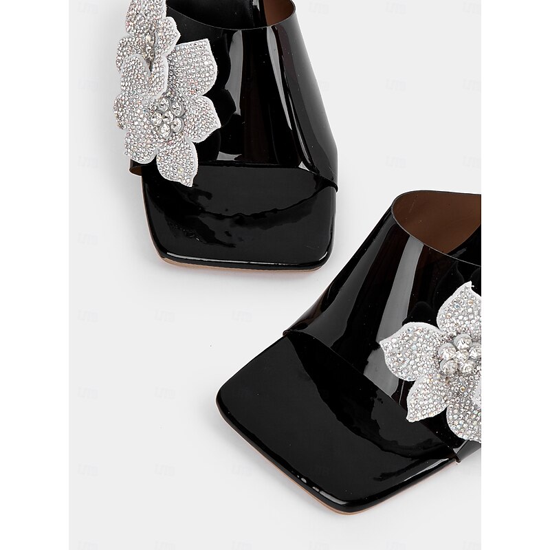 Women's Black Patent Leather Mules with Rhinestone Flower and Transparent Heels - Chic Nightlife Party Sandals