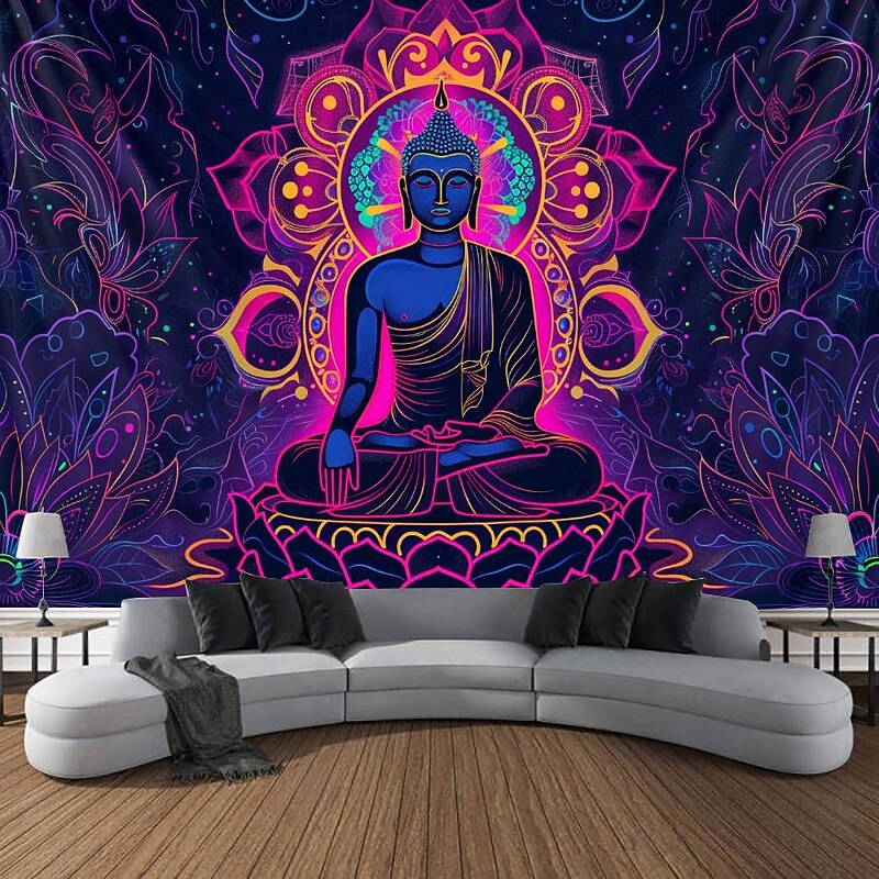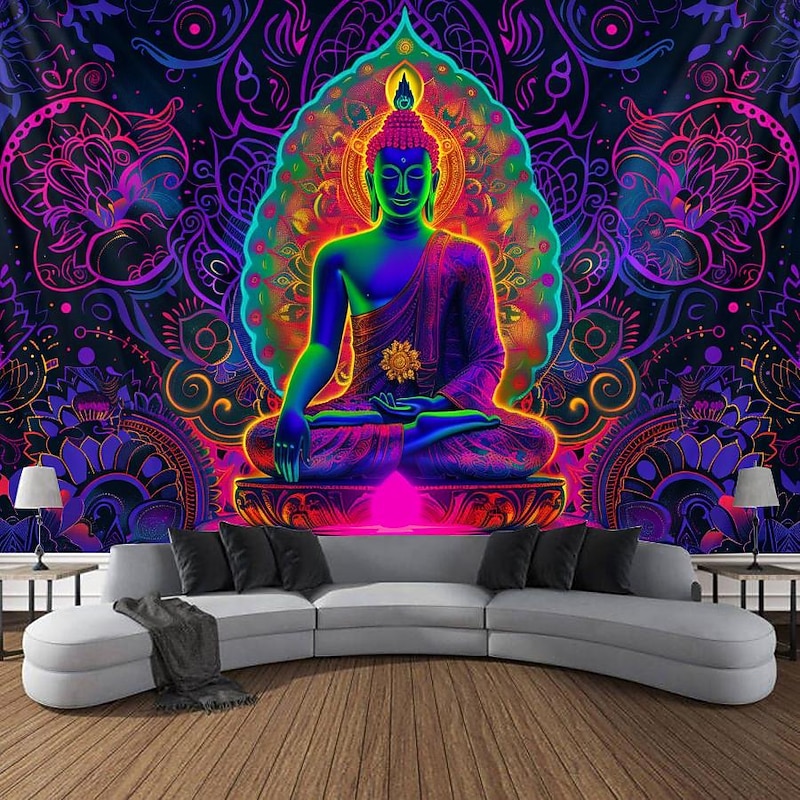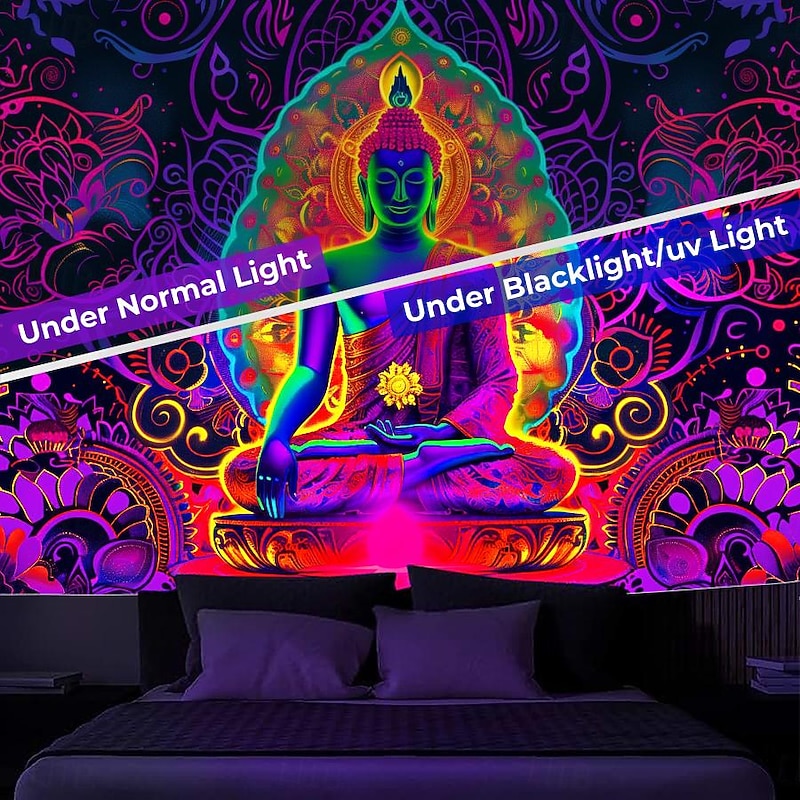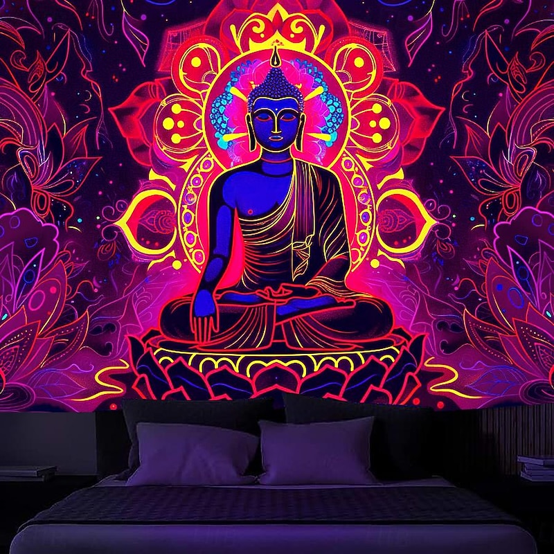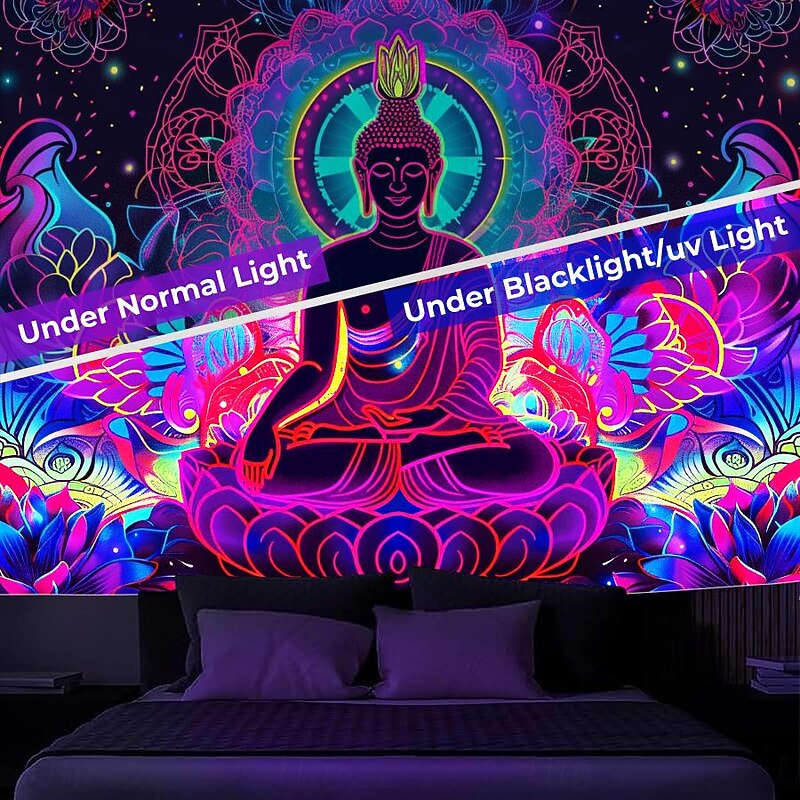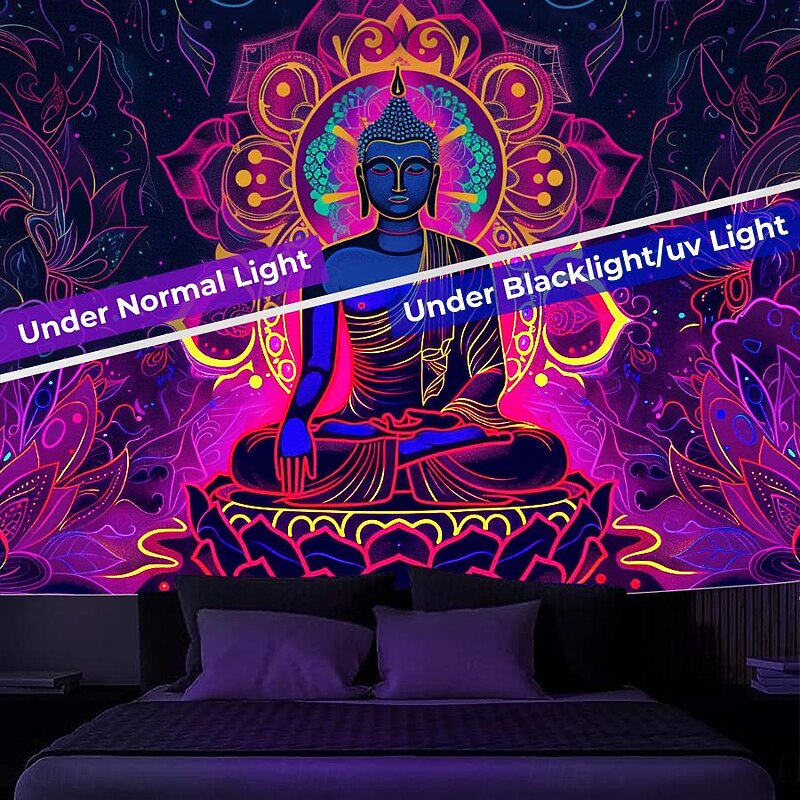 Bohemian Buddha Blacklight Tapestry UV Reactive Glow in the Dark Glow Party Lotus Trippy Misty Nature Landscape Hanging Tapestry Wall Art Mural for Living Room Bedroom