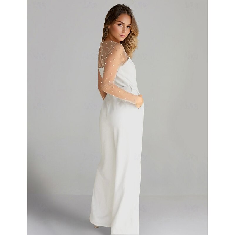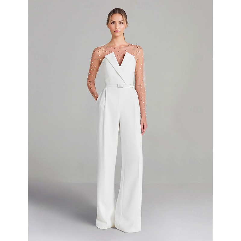 Jumpsuits Evening Gown Elegant Dress Formal Wedding Floor Length Long Sleeve Illusion Neck Pocket Stretch Crepe with Pearls Pocket