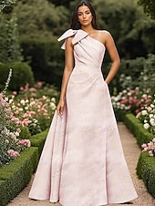 Why Choose Metallic Marble Jacquard Dress A-Line Evening Gown Elegant Dress Formal Wedding Floor Length Sleeveless One Shoulder Brocade with Bow(s) Pleats Wedding Guest Dress?