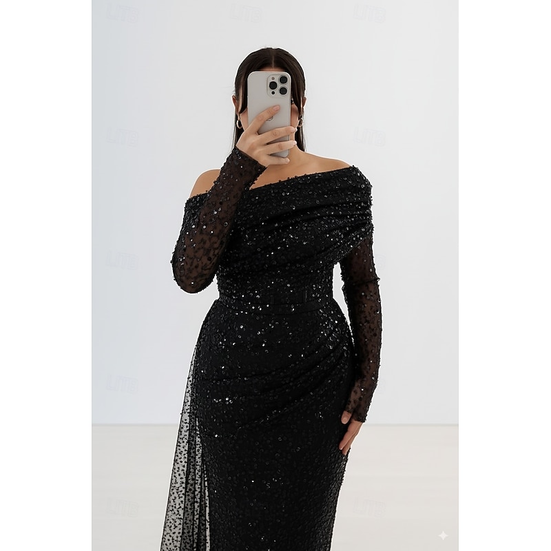 More information about Red Black Sheath / Column Evening Gown Elegant Formal Dress Formal Wedding Floor Length Long Sleeve One Shoulder Sequined with Glitter 2025