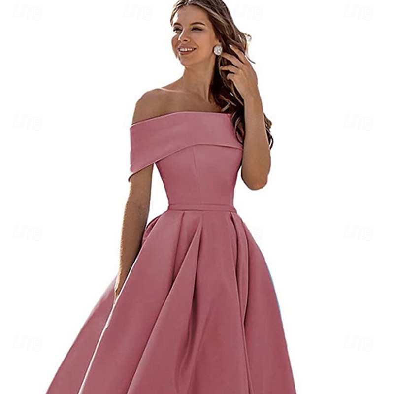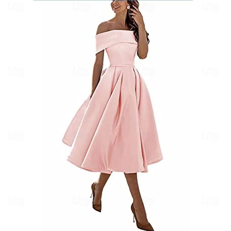 sought-after ! A-Line Cocktail Dresses Elegant Dress Formal Wedding Tea Length Sleeveless Off Shoulder Satin Backless with Pleats
