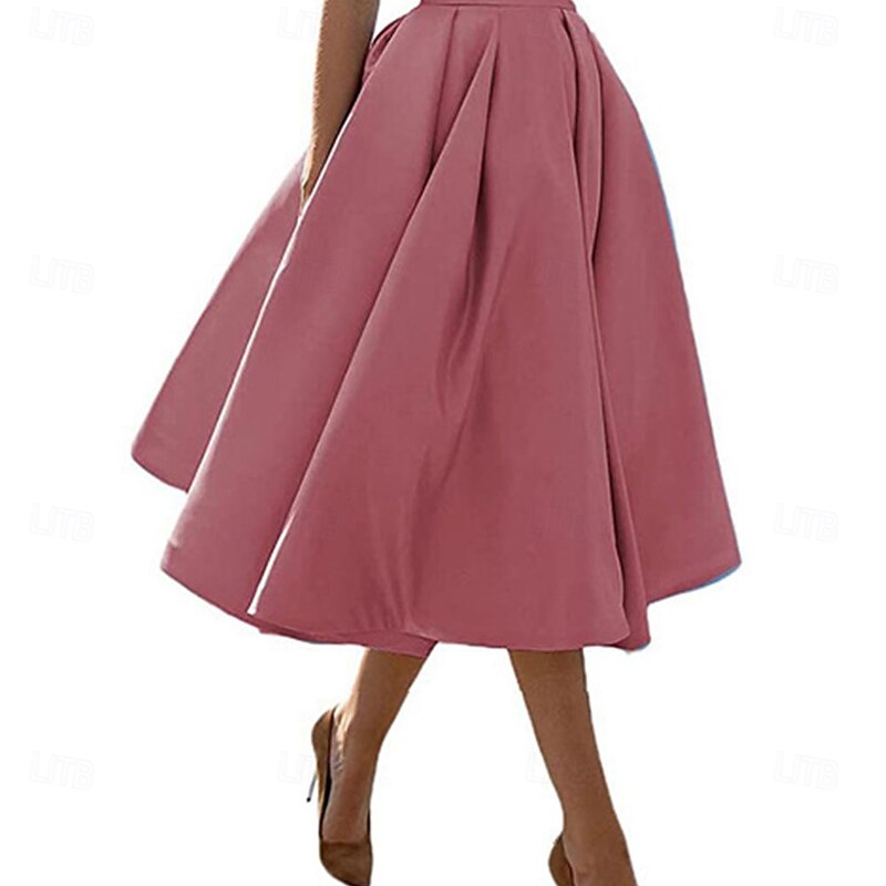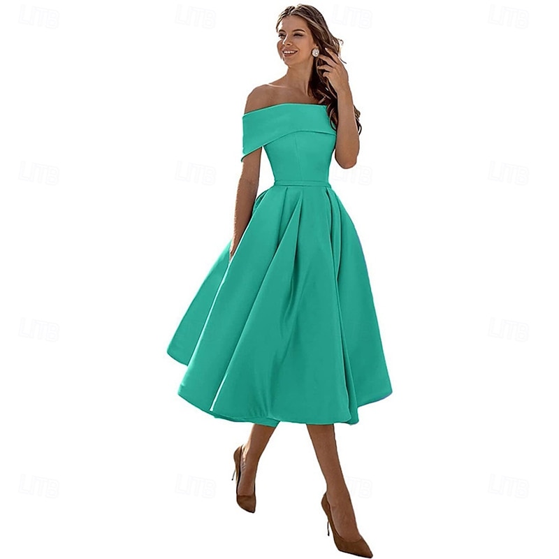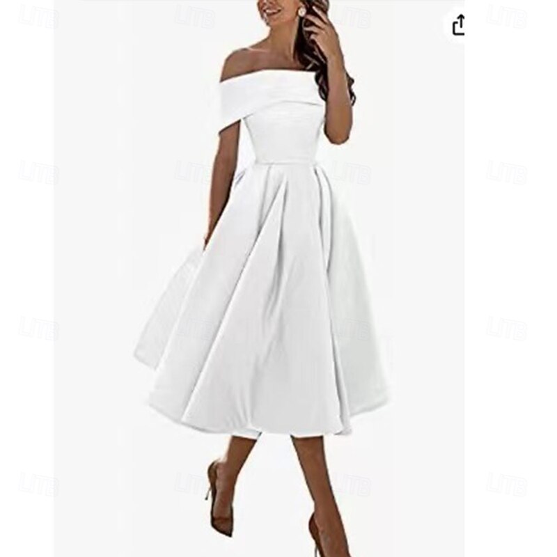 More information about A-Line Cocktail Dresses Elegant Dress Formal Wedding Tea Length Sleeveless Off Shoulder Satin Backless with Pleats