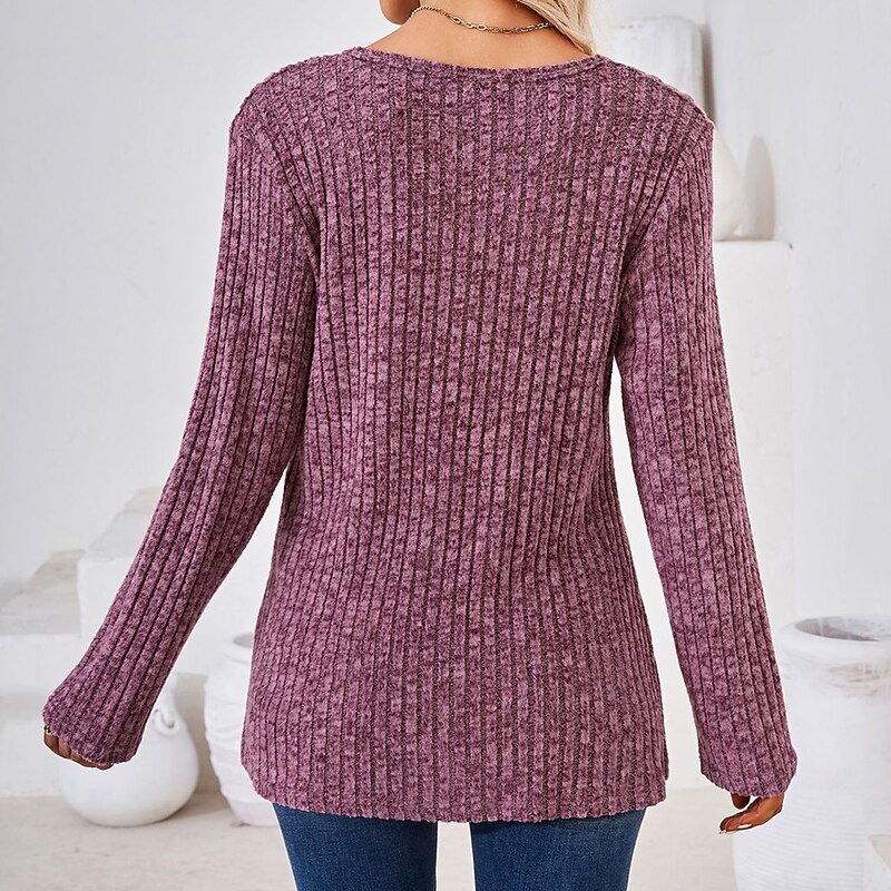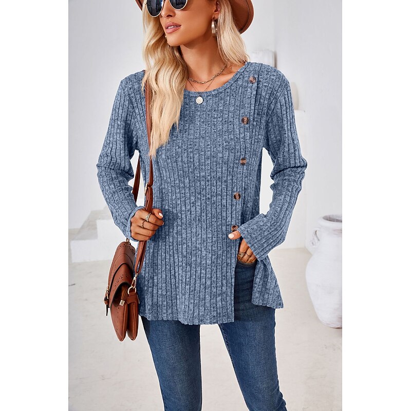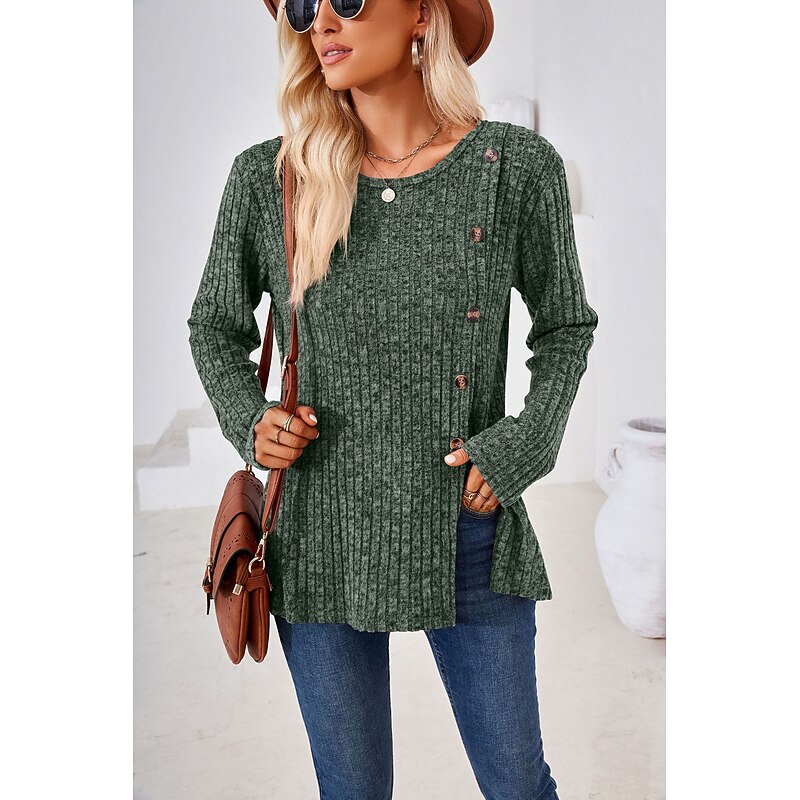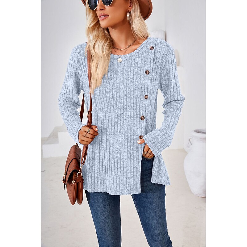 Highlights [Fabric] : Crafted from a high-quality polyester and ribbed fabric blend, this T-shirt ensures both comfort and durability. The micro-elastic material provides a soft touch while maintaining its shape, making it ideal for everyday wear. [Fit] : Designed with a regular fit, the T-shirt offers a relaxed and comfortable silhouette. The round neckline and long sleeves complement the overall effortless style, perfect for layering during the cooler fall and winter seasons. [Design Highlights] : The T-shirt's standout details include contemporary decorative buttons along one side and a chic split design that adds a new-age twist to its classic appeal. The solid color palette enhances its versatile design, making it an ideal addition to any wardrobe. [Occasions] : Suitable for daily casual wear, this T-shirt effortlessly transitions from laid-back weekends to casual outings. Its timeless style allows it to pair effortlessly with a range of outfits, bringing a touch of sophistication to your everyday look. [Size Range] : Available in a variety of sizes from S to 2XL, ensuring a comfortable fit for a wide range of body types. The diverse color options, including blue, green, black, wine, light blue, and light grey, offer numerous styling possibilities.