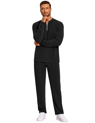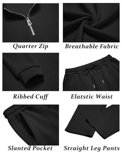 • 【2 Piece Tracksuits】: Mens sports suit top featuring with quarter zip, round collar neck, long sleeves and ribbed cuffs. The mens jogger pant with straight-leg ankle-length trousers in a basic fit with an elasticated waistband to keep you on the move. Reversible slanted pockets allow you to carry your keys, phone, wallet, earphones and more.user-friendly for workout.