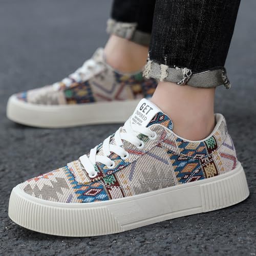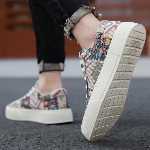 tazimall Men's Ethnic Pattern Lace-up Platform Sneakers, Casual Canvas Shoes