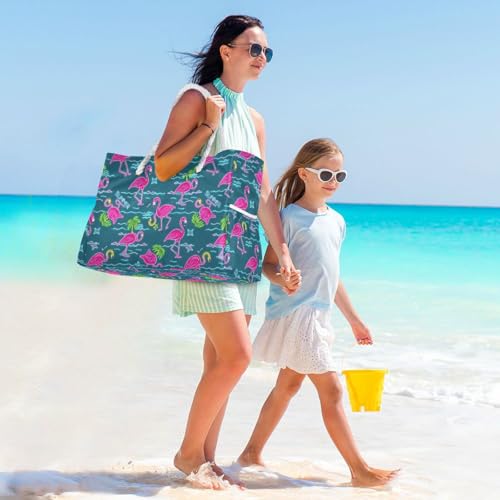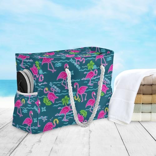Summer Neon Flamingo Coconut Tree Blue Portable girls beach bag with zipper work tote bags for women with cup holder Good for Travel Pool Swim Beach Vacation Necessities