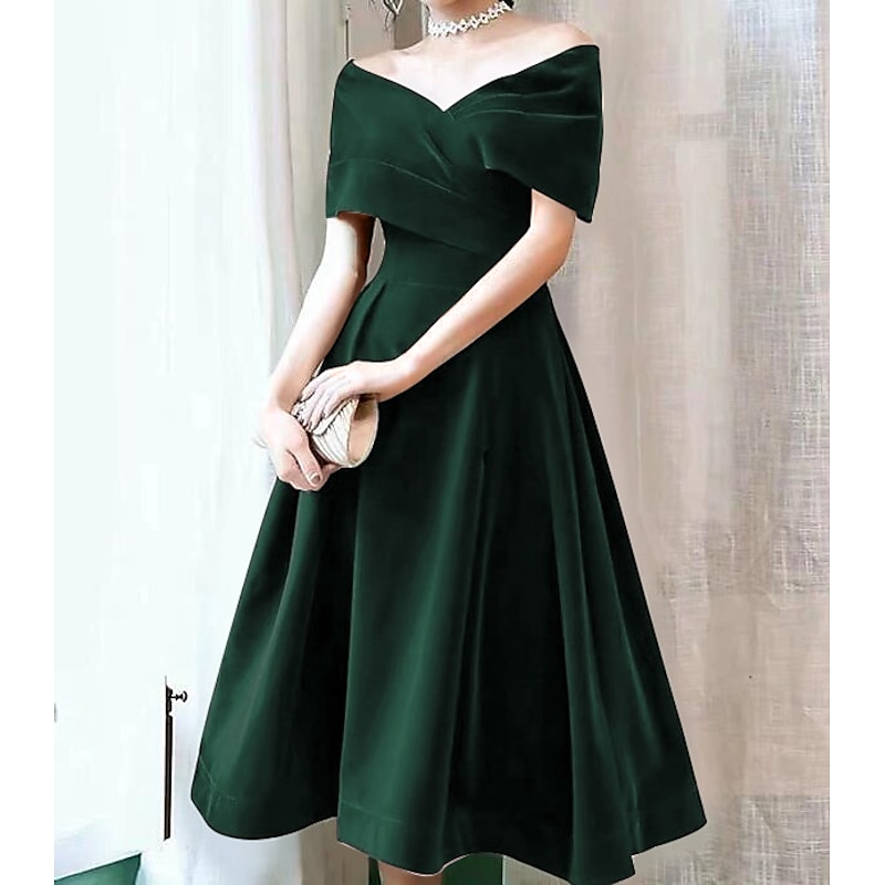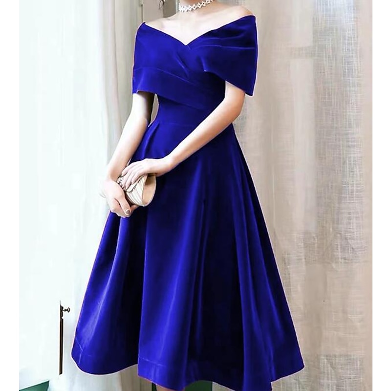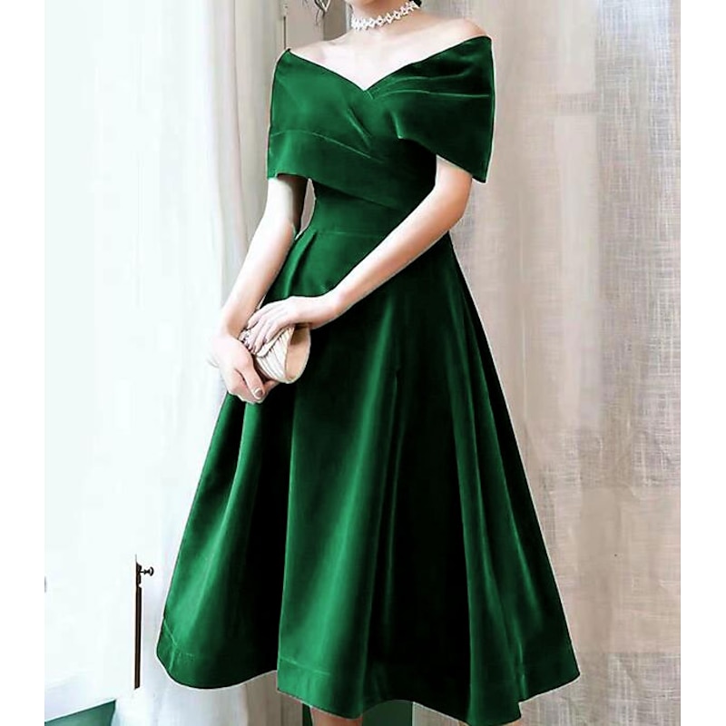 Why Choose A-Line Cocktail Dresses Elegant Dress Wedding Guest Knee Length Short Sleeve Off Shoulder Velvet with Pleats Pure Color Dresses?